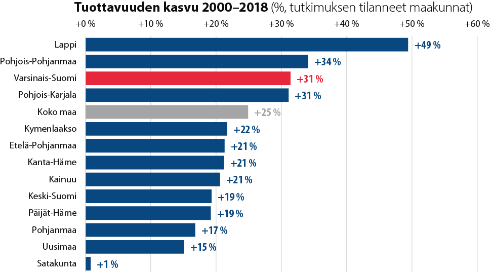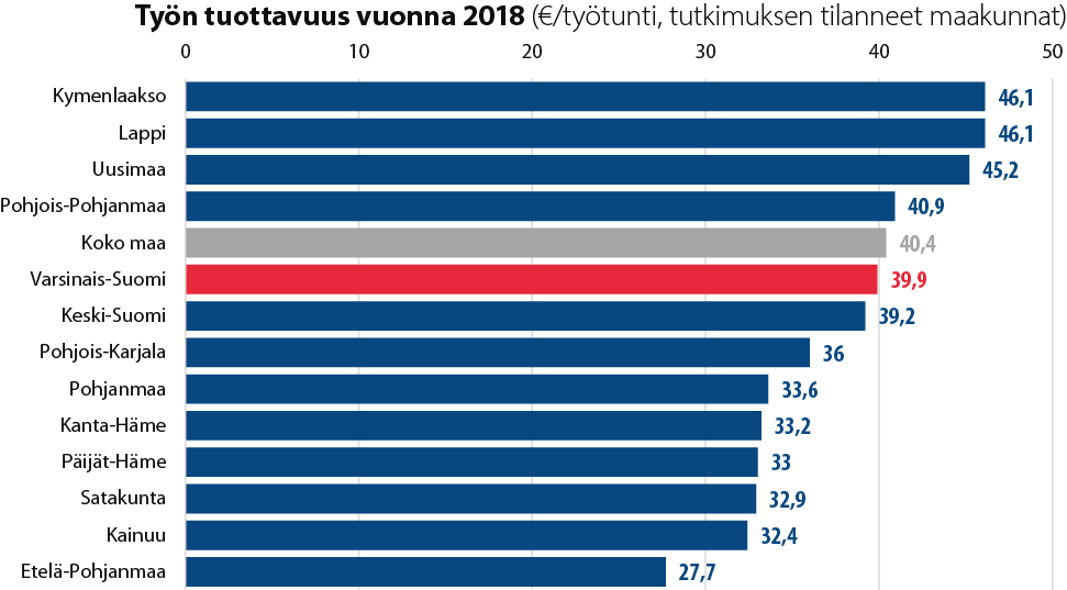 Tutkimuksen mukaan työn tuottavuus oli vuonna 2018 Varsinais-Suomessa noin 40 euroa työtuntia kohden, mikä oli hieman koko maan tasoa alempi ja kaikista maakunnista 7. korkein. Työn tuottavuus kasvoi Varsinais-Suomessa kuitenkin yhteensä 31 % vuosina 2000–2018, mikä oli maan kolmanneksi nopein kasvuvauhti.