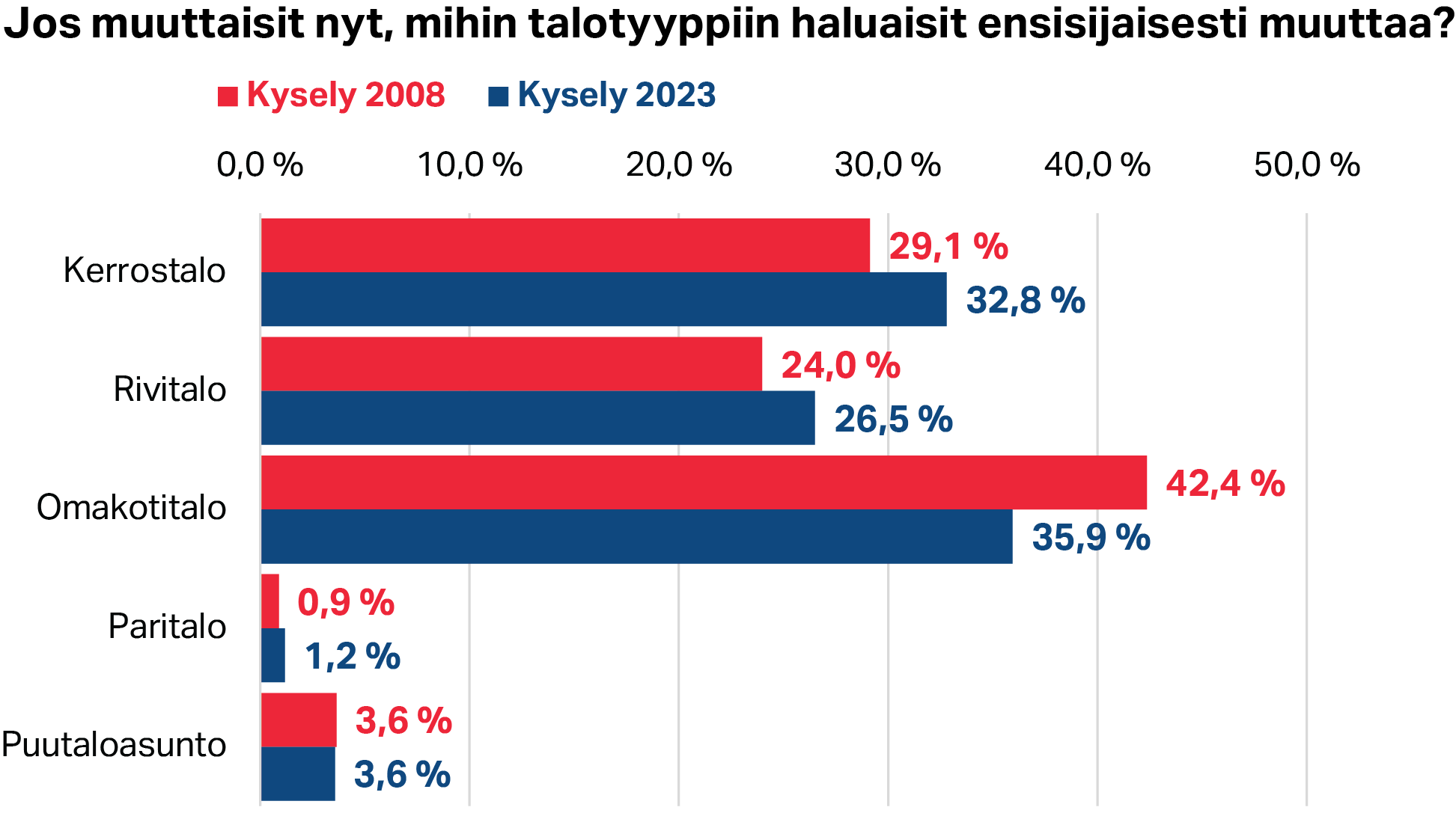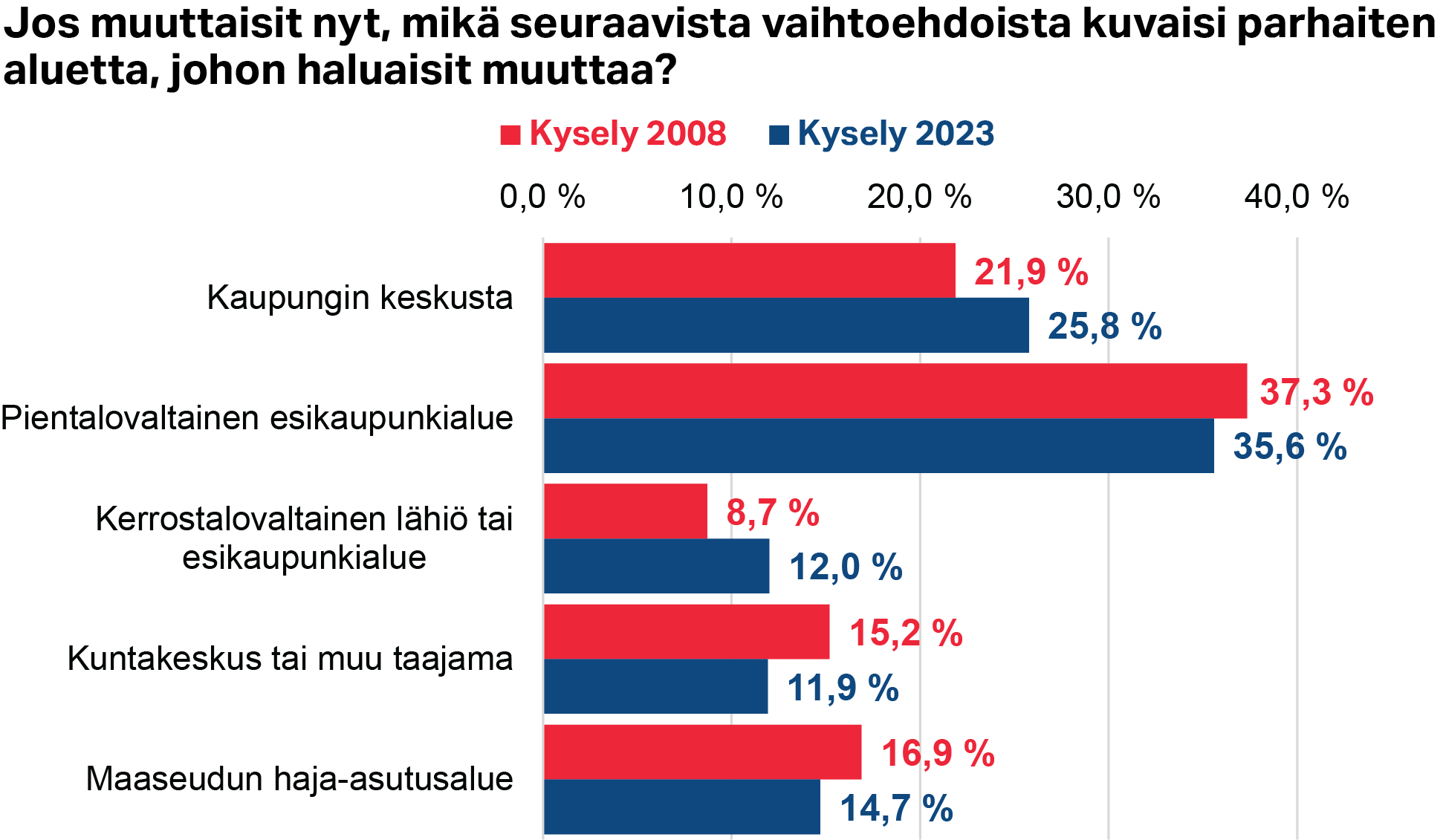 Kyselyn mukaan Turun seudun asukkaiden asumistoiveet ovat muuttuneet kaupunkimaisemmiksi vuosien 2008 ja 2023 välillä. Omakotitaloa mieluisimpana asumisvaihtoehtona pitävien osuus väheni ajanjaksolla 42 prosentista 36 prosenttiin ja kerrostaloa preferoivien osuus kasvoi 29 prosentista 32 prosenttiin. Rivitalon valitsisi asumismuotonaan 27 % Turun seudun asukkaista, ja myös rivitalon suosio on kasvanut hieman.
