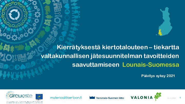 SuunnitelmaKierrätyksestä kiertotalouteen – tiekartta valtakunnallisen jätesuunnitelman tavoitteiden saavuttamiseen Lounais-SuomessaIlmastonmuutos ja kiertotalous Lataa tiedosto: Kierrätyksestä kiertotalouteen – tiekartta valtakunnallisen jätesuunnitelman tavoitteiden saavuttamiseen Lounais-Suomessa Avaa selaimessa: Kierrätyksestä kiertotalouteen – tiekartta valtakunnallisen jätesuunnitelman tavoitteiden saavuttamiseen Lounais-Suomessa