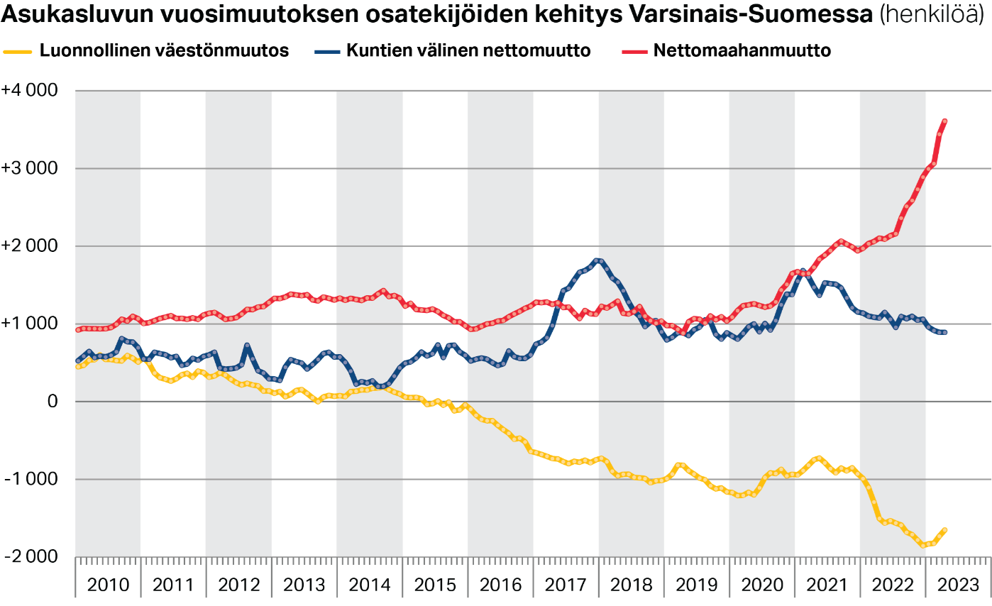 Myös maakunnan saama muuttovoitto ulkomailta on korkeammalla tasolla kuin koskaan ennen. Varsinais-Suomen ulkomailta tuleva muuttovoitto oli lähes 3 000 vuonna 2022, ja kasvu on vain kiihtynyt keväällä 2023 ukrainalaisten pakolaisten hakiessa kotikuntaa Suomesta. Sen sijaan luonnollinen väestönmuutos on painunut ennätyksellisen matalalle tasolle, sillä viime vuonna Varsinais-Suomessa syntyi lähes 2 000 ihmistä vähemmän kuin kuoli.