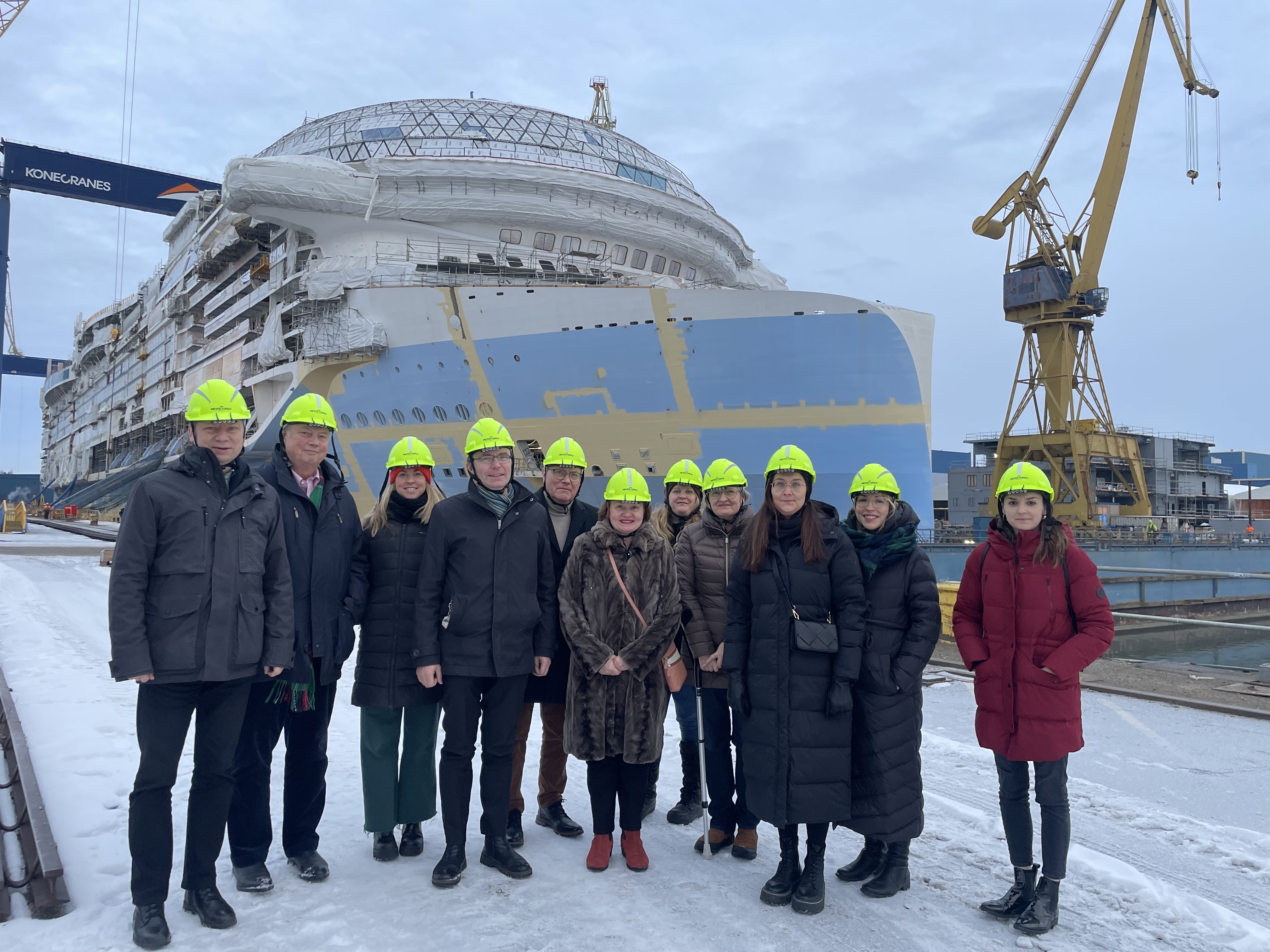 Ensimmäisen päivän ohjelman kruunasi vielä vierailu Meyer Turun telakalle, jossa Anna Hakala (Communication manager) ja Marjo Keiramo (Head of Group, Sales and Design) kertoivat itse telakasta, parhaillaan rakenteilla olevasta Icon of the Seas -aluksesta sekä käynnissä olevasta isosta NeCOLEAP-projektista. Meyer Turulla on kunnianhimoiset tavoitteet rakentaa entistä kestävämpiä ja ilmastoneutraaleja risteilyaluksia sekä ulottaa kehitystyö myös telakka-alueen toimintoihin. Keiramon mukaan Varsinais-Suomessa ja Turussa erityisiä vahvuuksia ovat meriteollisuuden korkea osaaminen ja pitkä historia, hyvä kapasiteetti, teknologinen osaaminen sekä monipuolinen toimijaverkosto. Myös kestävän kehityksen osaaminen on korkeaa ja arvostettua maailmalla.