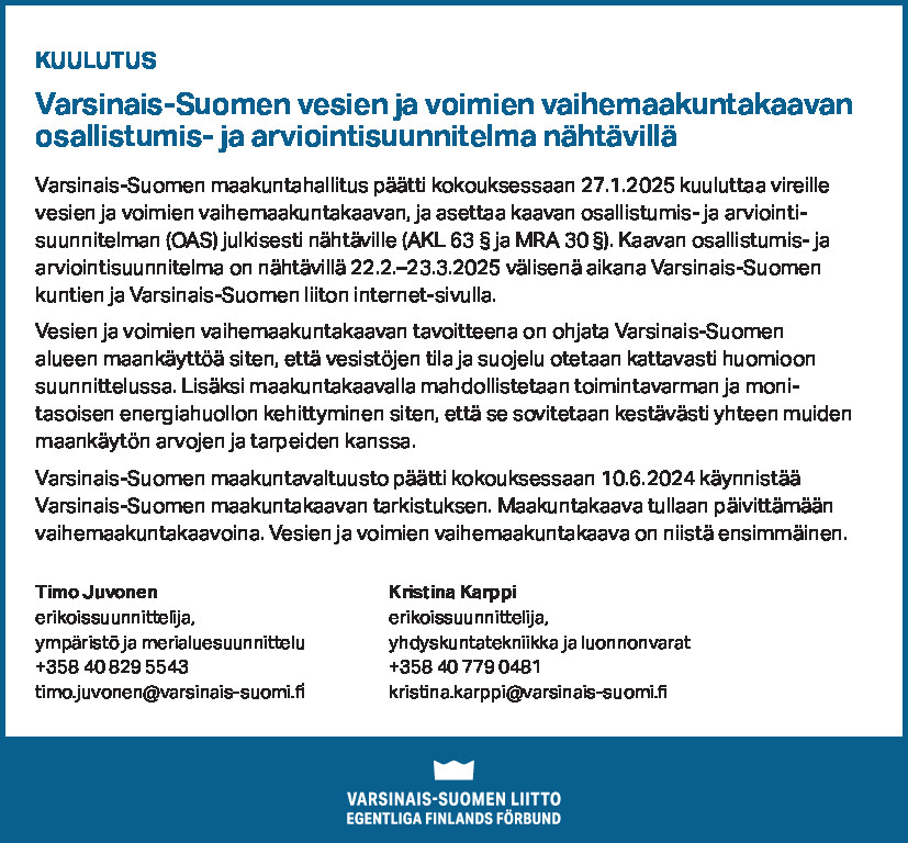 Kungörelse om programmet för deltagande och bedömning i anslutning till etapplandskapsplanen för vattenvård och energi i Egentliga Finland