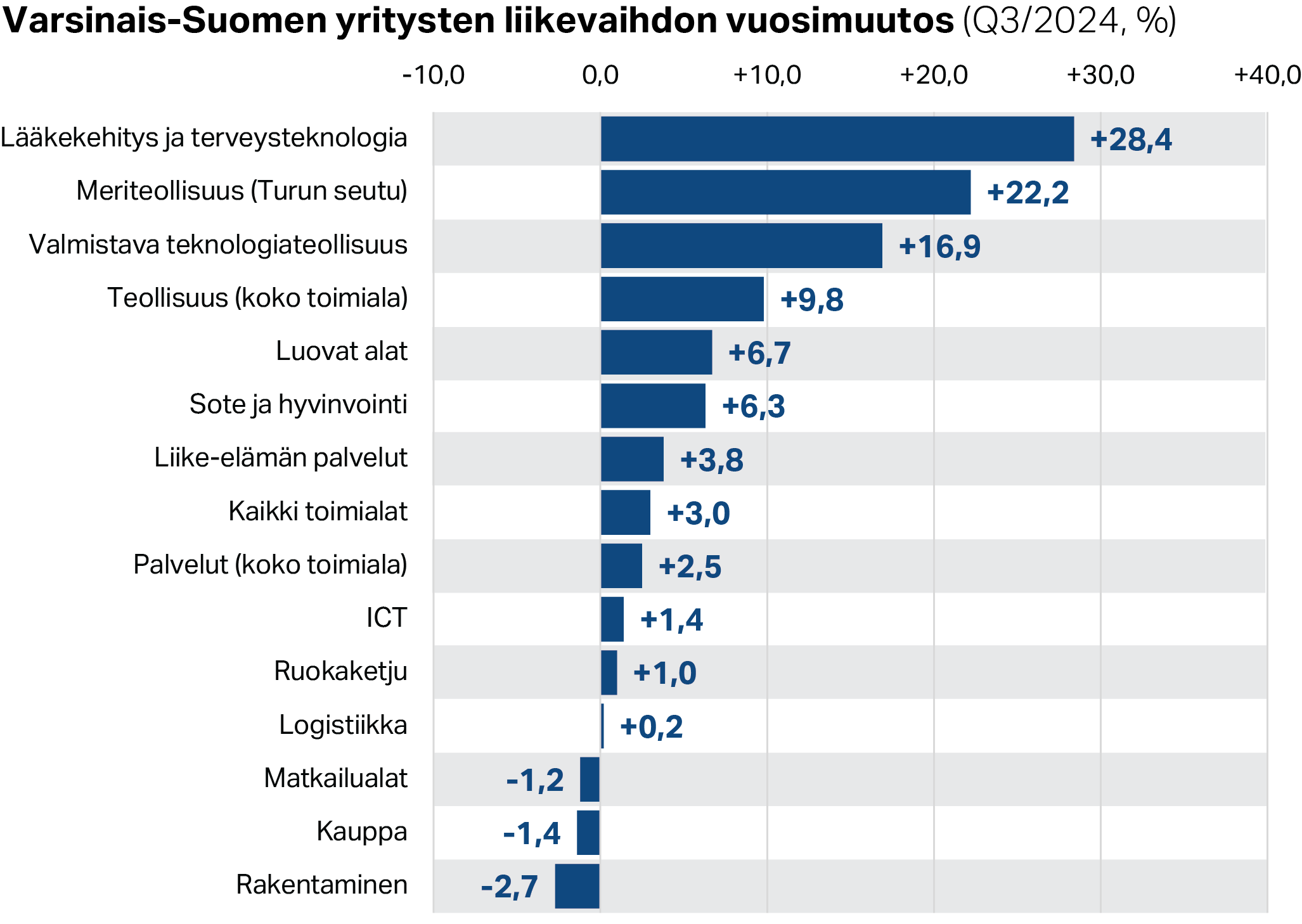 Seuratuista aloista voimakkaimmin kasvoivat teollisuuden alat, erityisesti lääkekehitys ja teknologiateollisuus meriteollisuuden vauhdittamana. Myös palvelujen liikevaihto oli kasvussa. Vaikka kasvuvauhti jäi jälkeen teollisuudesta, oli erityisesti luovien alojen, sote-palvelujen ja liike-elämän palvelujen kasvu voimakasta. Myös ICT-alan liikevaihdon trendikehitys kasvoi vahvasti, vaikka viime vuoden kolmannen neljännen kasvuprosentti jäi maltilliseksi.