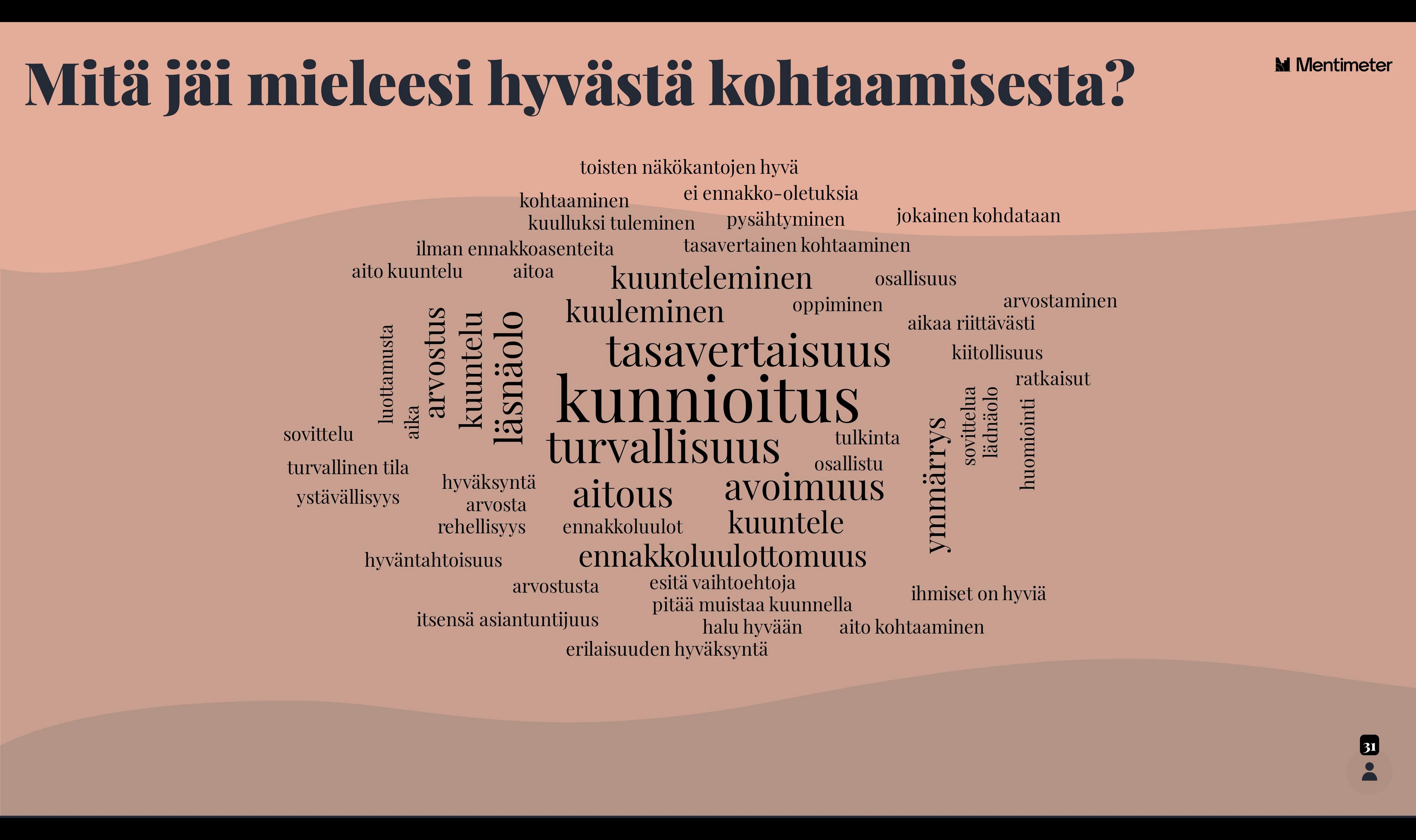 Kuten kaikessa yhteisöllisessä työssä, niin myös järjestötyössä onnistumisen kannalta ratkaisevaa on se, miten kohtaamme toisemme. Toiminta eri muodoissaan on tärkeää, mutta jos yhteisön jäsenet, työntekijät tai luottamushenkilöt eivät koe, että heitä kuullaan, jää toiminta toisarvoiseksi ja vajaaksi. Erityisen tärkeää kohtaaminen on vapaaehtoistoiminnassa. Osaatko kunnioittaa toisen näkemystä? Osaatko kohdata toisen ilman ennakkoluuloja? Osaatko ottaa vaikeita asioita keskusteluun rakentavalla tavalla? Näistä teemoista tilaisuuden osallistujia haastoivat Tukenasi ry:n Nuorten raadin jäsenet ja kohtaamiskouluttajat Vanessa Peitilä ja Suvi Saarialho. Esityksen aikana kerätyssä sanapilvessä osallistujat tunnistivat hyvän kohtaamisen aineksiksi muun muassa kunnioituksen, turvallisuuden, tasavertaisuuden, avoimuuden ja läsnäolon.